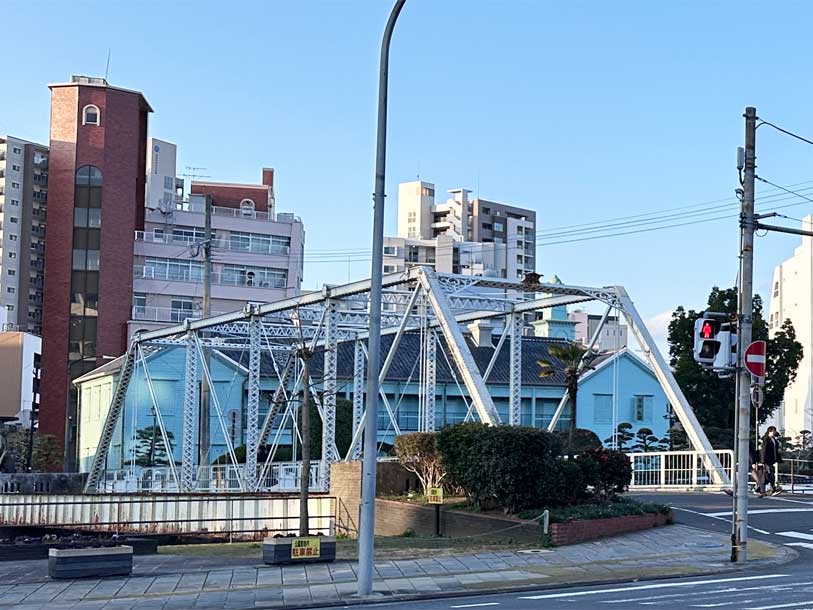 出島橋 は、出島東端に架かる橋長36mのプラットトラス形式の単桁橋です。架設当初から車道としての機能を備え続けている鉄製道路橋として、我が国に現存する最古のものです。