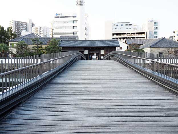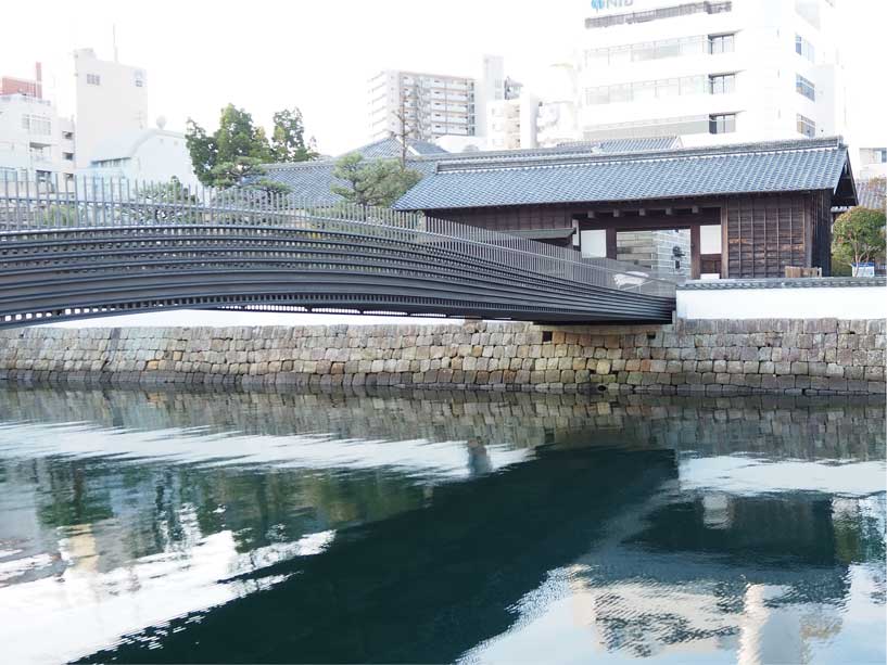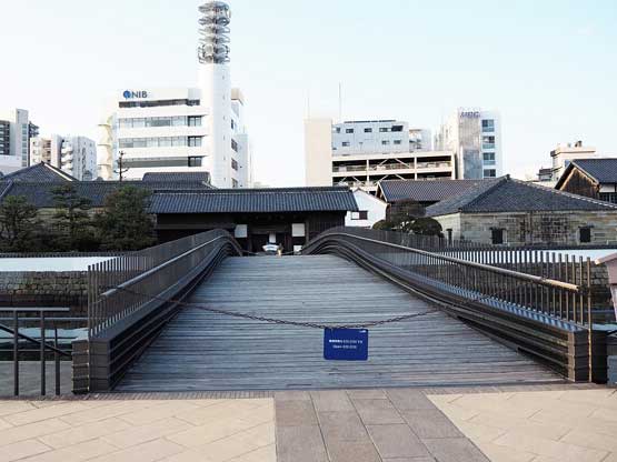 出島表門橋 は、出島築造当時に旧出島橋があった位置に、平成29年(2017年)に架橋された、幅4.4m、長さ38.5mの鋼鉄製の橋です。旧出島橋は長さ4.5mの石橋でしたが、国指定史跡である出島を削ることができないため、当時の橋を復元することはできず、また、川幅も当時より大幅に拡張されており、このような現代の橋を架橋しました。