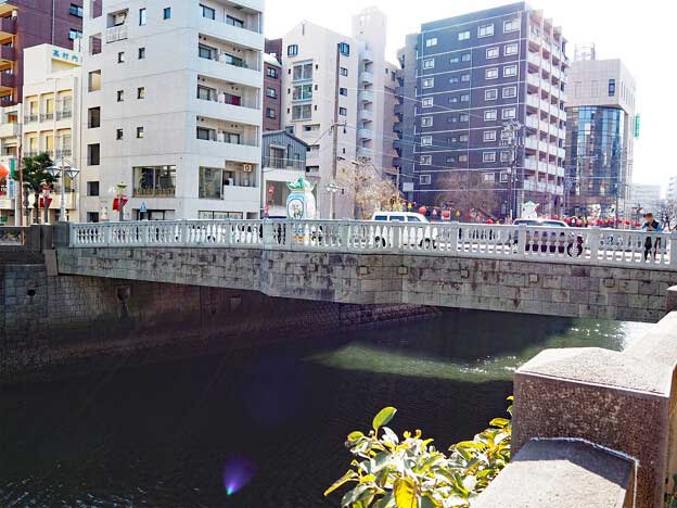 「鉄橋」は、中島川の下流に架かるRC橋のひとつで、浜町アーケードの西側入口に架かる橋で、国道324号の一部です。