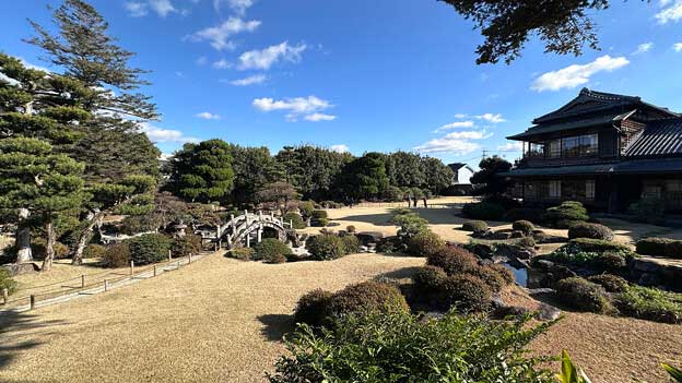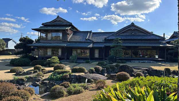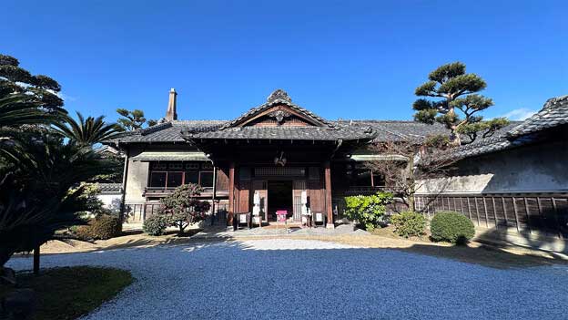 高い塀は旧長崎街道に面しており、福岡市天神町にあった別邸(通称銅御殿)から昭和初期に移築された長屋門や、伊藤商店の事務所が目を引きます。邸宅は南棟(正面)、北棟(庭側)、両者を結ぶ繁棟、西棟の家屋四棟と土蔵三棟からなり、池を配した広大な回遊式庭園を持つ近代和風住宅です。