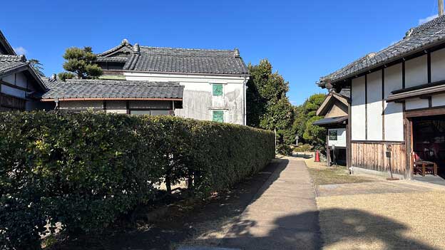 正面に写る土蔵は「骨董蔵」 右手に写る建物が「書生棟」 この遊歩道を進むと庭園