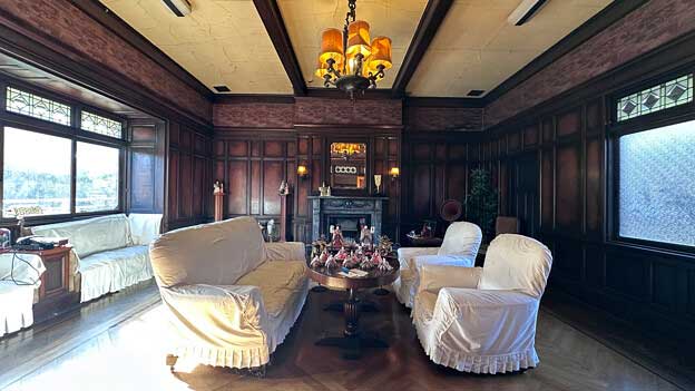 「書斎」 壁に、帯の絹の繊維を解いて塗りこめたという珍しい布壁が使われ、出窓の欄間には、英国式のステンドグラスがはめ込まれている