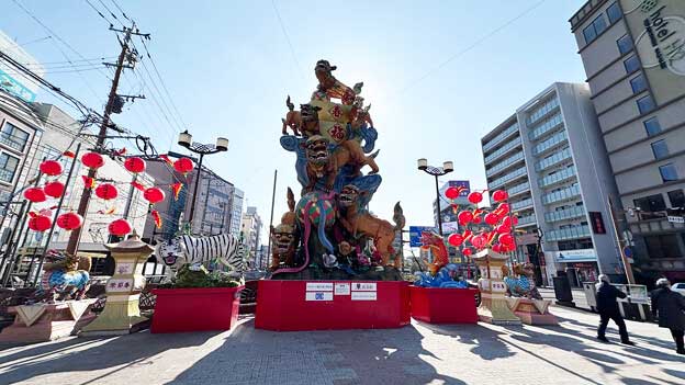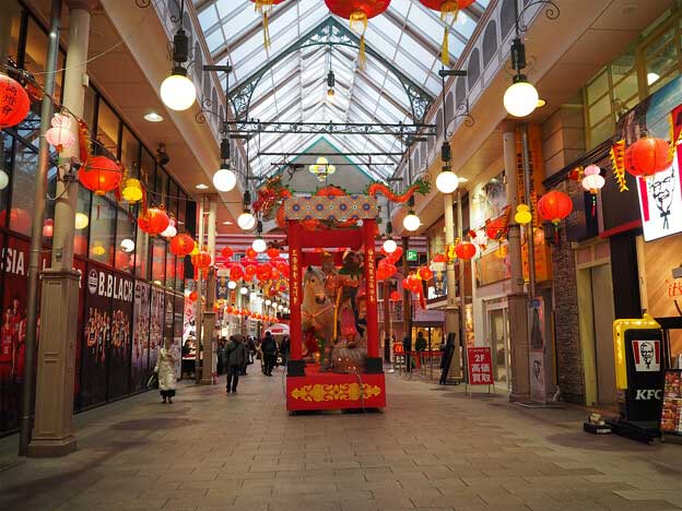 「長崎ランタンフェスティバル」期間中の「浜んまち会場(浜町アーケード周辺)」は、アーケードの天井をランタンがうめつくし、巨大オブジェがアーケード内に並びます。ショッピングや食事を楽しみながら、ランタンフェスティバルを満喫しましょう。