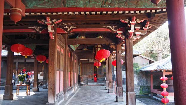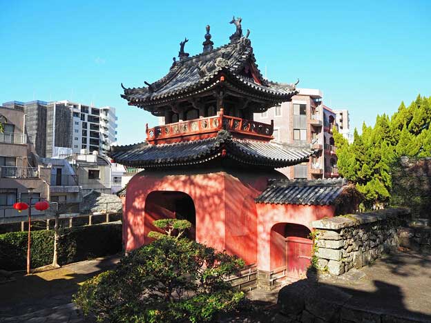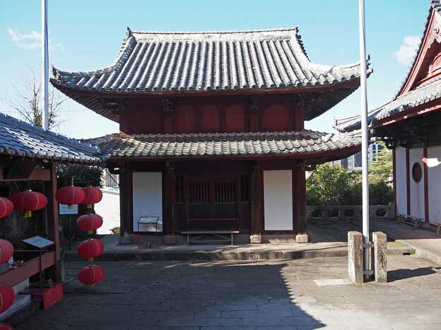 崇福寺の入口にある楼門は、竜宮門とも呼ばれる「三門」です。嘉永2年(1849年)に棟梁大串五郎平が中国人の指導を受け、他の技術者も全て日本人の手で造りました。