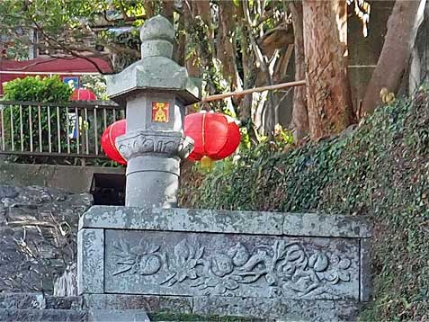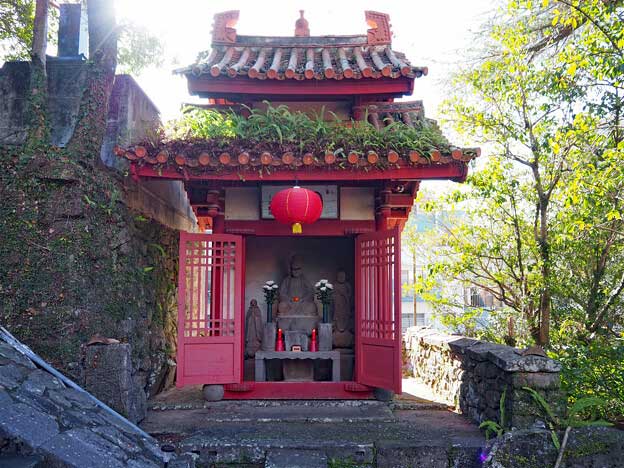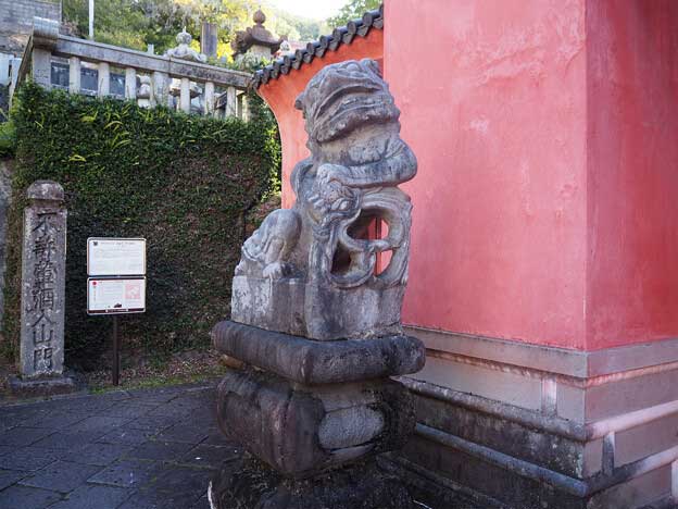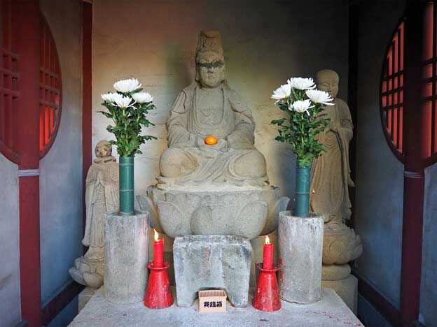 竜宮門と呼ばれる三門をくぐると、石段があり、その先に第一峰門が見えます。階段の途中、左手には観世音菩薩、右手には・・・祠に入った石像が・・・扁額を見ても何て書いてあるか分からない・・・