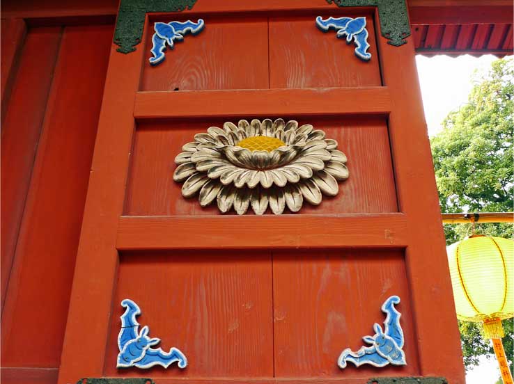 第一峰門の扉には、中央に牡丹の花、四隅に青い蝙蝠が施されています。中国で縁起物とされる模様です。蝙蝠は「蝠」の音が「福」と同じ「フウ」であるため、幸福や吉祥のシンボルです。牡丹は「百花の王」と称され、富貴、繁栄、幸福、そして不老長寿を象徴します。