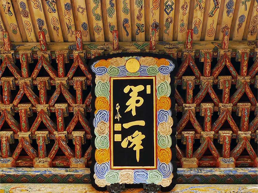第一峰門の軒裏には「四手先三葉栱斗栱詰組(よてさきさんようきょうときょうつめぐみ)」 と呼ばれる複雑巧妙な詰組みがびっしりと組まれており、これは国内に例がなく、華南地方にもまれと言います。平垂木(ひらたるき)を放射状に割付けた扇垂木(おうぎだるき)に鼻隠板(はなかくしいた)打ちで、極彩色模様が施されていますが、雨がかり部分は単なる朱塗りです。当初材は広葉杉(こうようざん)であることが確認されています。 正面に掛る「第一峰」の額は即非禅師による物で、県指定有形文化財に指定されています。