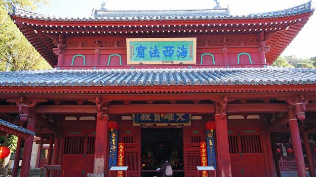 国宝「大雄宝殿」は、崇福寺の本堂で、正保3年(1646年)に唐商の何高材(がこうざい)からの寄進によって創建された、長崎市に現存する最古の建物です。はじめは単層屋根でしたが、天和元年(1681年)魏之琰(ぎしえん)が日本人棟梁を使い、入母屋屋根の上層を追加し、現在の姿になりました。