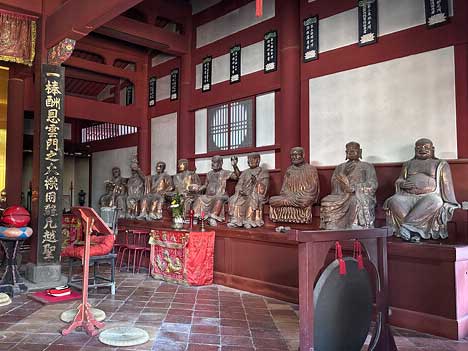 左右に並ぶ十八羅漢は中空の奇木造で麻布を置き漆で固めた物です。延宝5年(1677年)羅漢奉加人数という巻物が三尊の体内から発見されました。