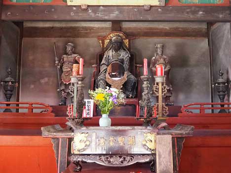 大雄とは釈迦如来のことを指し、この大雄宝殿の中に本尊である釈迦如来三尊坐像が安置されています。この本尊には内臓があります。昭和10年頃の仏像修理の際内部から銀製の五臓、布製の六腑などが発見されました。金属の五臓があるのはこの釈迦如来が唯一と云われています。