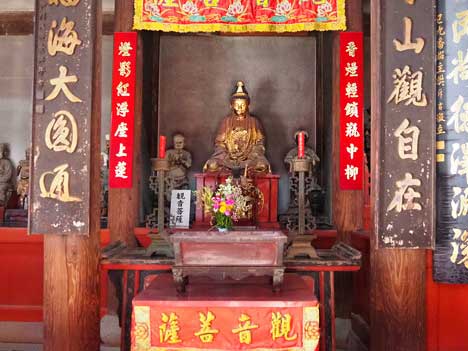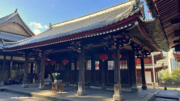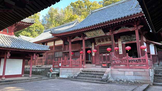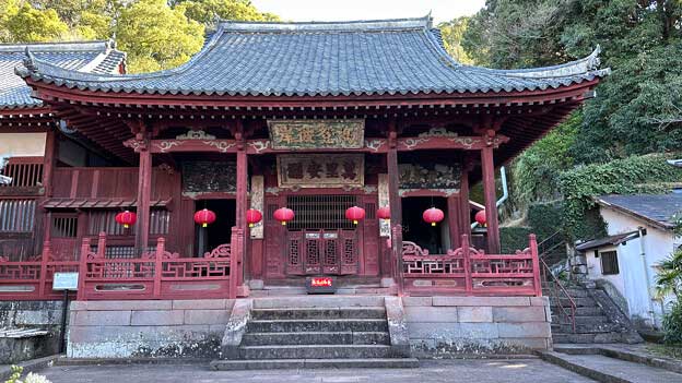 享保16年(1731年)に建立された物で、中央に観音菩薩を祀る「観音堂」、右に関帝(関羽)を祀る「関帝堂」、左に韋駄天を祀る「天王堂」を配します。黄檗(おうばく)天井・柱上部藤巻(とうまき)・挿肘木(さしひじき)・扇垂木(おうぎたるき)・鼻隠板(はなかくしいた)・半扉など、中国様式ですが、屋根の妻飾(つまかざり)は日本風であることから、軸部を中国で切組んだものを唐船で運び、日本人棟梁が建てたものと思われます。梅花奇獣の浮彫りのある柱礎(ちゅうそ)も中国製です。当初材は広葉杉(こうようざん)であることが確認されています。