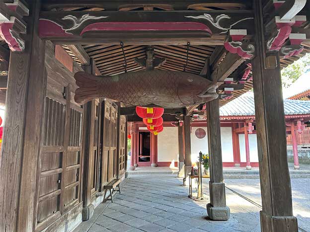 媽祖門の隅に「魚板」が下がっています。魚板(魚鼓)とは、主に禅宗寺院でお坊さんたちに飯時を告げるため叩いた木彫の魚で、木魚の原型と言われています。