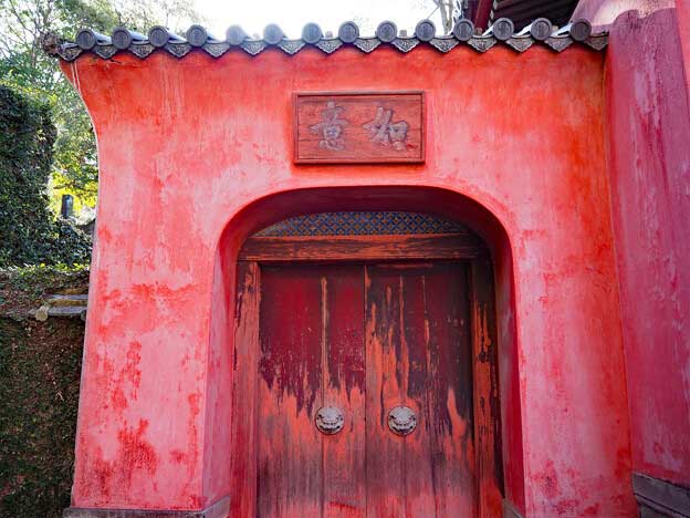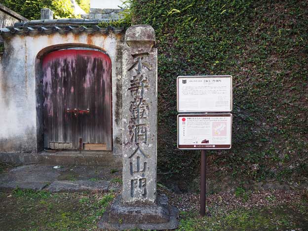 崇福寺の山号「聖寿(しょうじゅ)山」の横額が楼上正面にあり、隠元禅師の筆で県指定有形文化財に指定されています。左側の門には「如意」、右側の門には「吉祥」と書かれています。この「崇福寺三門」をくぐり、階段を上ると国宝「第一峰門」があります。