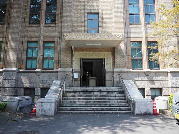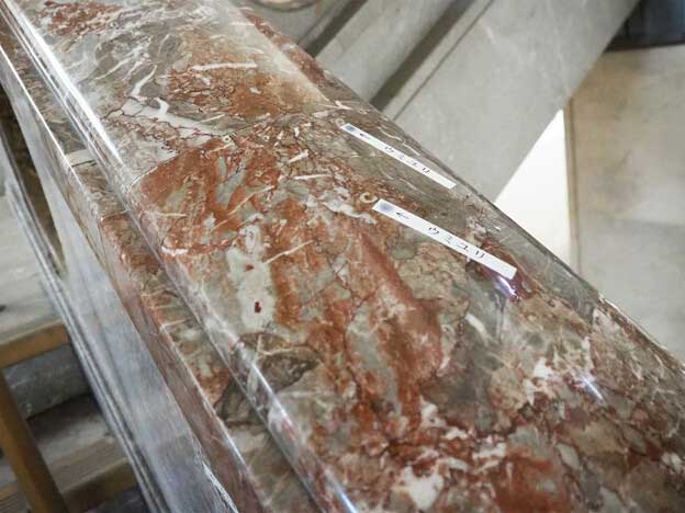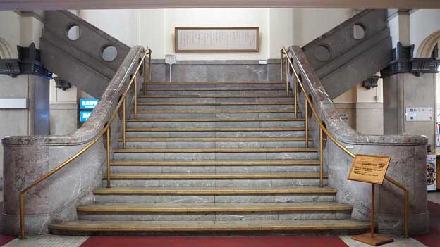 正面階段の手すりに使用されている大理石は、宮崎県北部の五ヶ瀬町鞍岡(祇園山)から切り出されたものです。手すりには約4億年以上前のサンゴなどの化石が見られます。