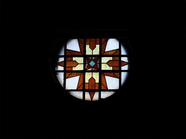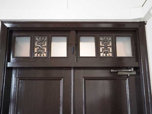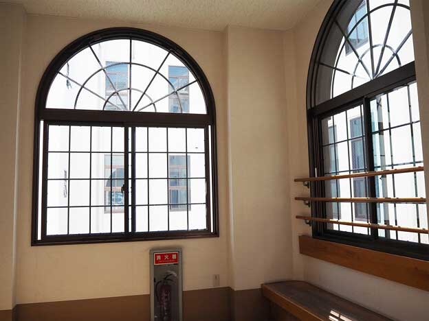 県庁本館には合計8個の丸窓があり、矢羽模様のステンドグラスが装飾されています。丸窓は昭和初期の建築物に多く見られ、当時の豪華客船の窓に影響を受けています。
