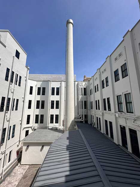 宮崎県庁本館の煙突は、建設当時に使用されていた暖房施設の一部で、高さ32mあります。建設当時は、地下のボイラー室で加熱された蒸気が建物内の各部屋に送られ、冬でも室温を約22度に保つ機能がありました。