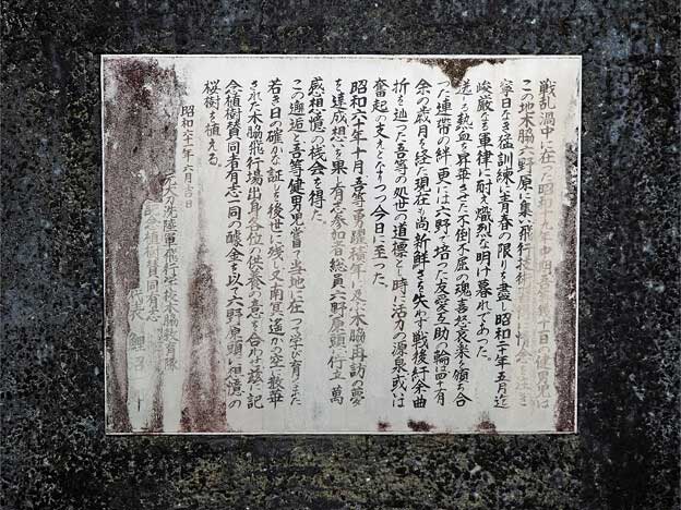 宮崎県東諸県郡国富町の六野原台地には、昭和18年(1943年)11月に開校した、大刀洗陸軍飛行学校の分教場「木脇教育隊」がありました。昭和20年(1945年)5月までの1年6ヶ月の間、全国各地から集まった若い兵士たち約500名が飛行訓練に従事しました。戦局が悪化し、特攻作戦が行われた時期ですので、ここを巣立った若者たちの多くも、南の空へ散ったことでしょう。