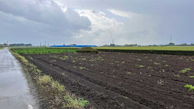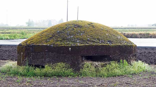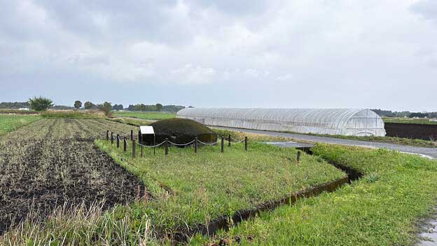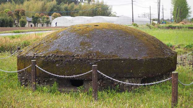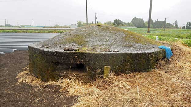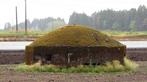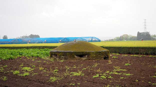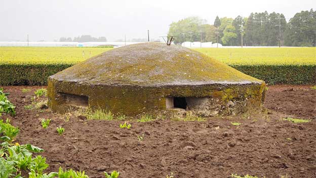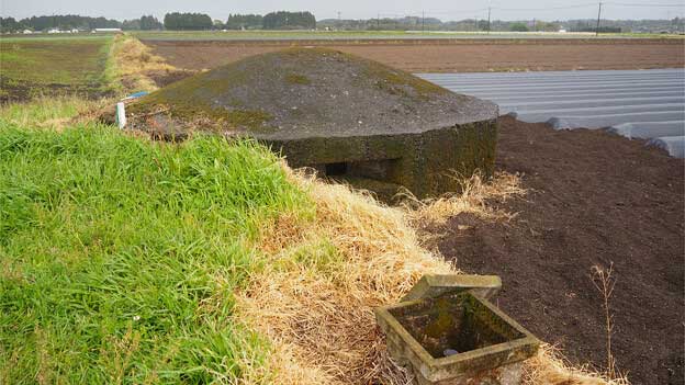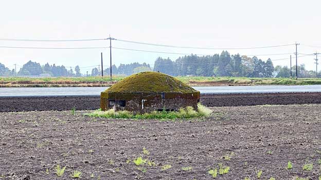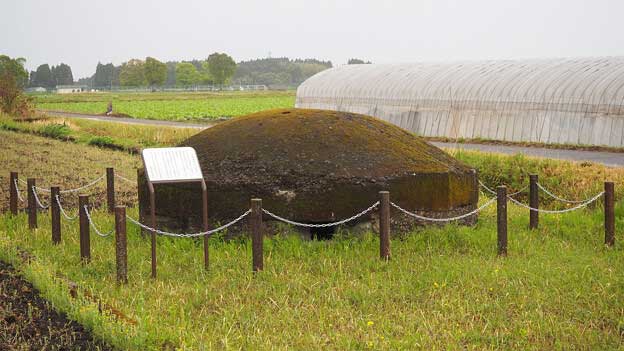 このトーチカは、畑の中にあるので、近づけません。トーチカの頭頂部から鉄骨が飛び出ており、まるで波平さんの頭みたい。こちらは良く見ると、出入口であった開口部が見えています。当時は開口部付近が掘り下げられて、人が出入りしていたのでしょう。