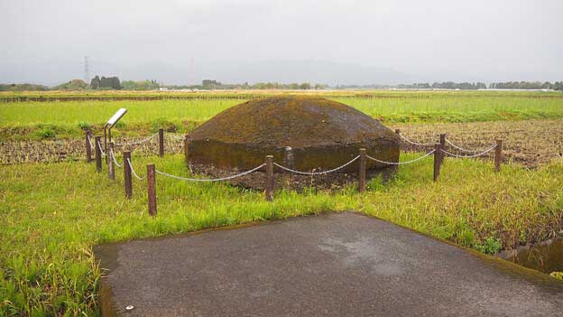 訪問時に最初に見つけたトーチカなので「①」としました。農道沿いにありますので、ぐるりと360°から眺められそうです。コンクリートの中に沢山の砂利が混ぜ込まれているのが分かります。人が入るための入口がどこかにある筈ですが、見えないので、恐らく農道側の埋まっている位置にあるのではないでしょうか。