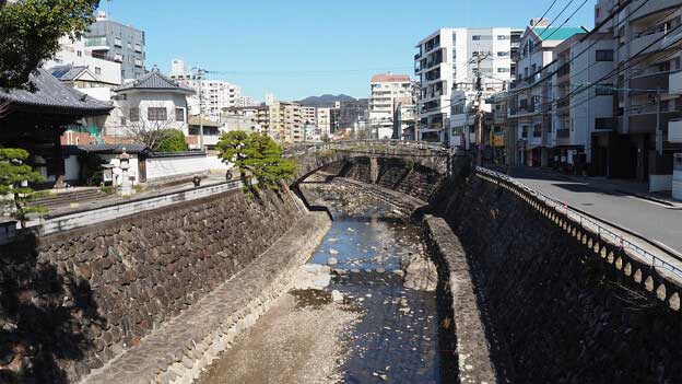 「古町橋」は、中島川に架かる石橋のひとつで、麹屋町と古町を繋いでいます。元禄10年(1697年)に架橋されましたが、享保6年(1721年)の洪水で流出しました。その後、元文4年(1739年)に架橋されますが、寛政8年(1796年)に再び流出します。享和3年(1803年)に再架橋されますが、昭和57年(1982年)7月の洪水で流失しました。昭和61年(1986年)に再架橋され、現在に至っています。