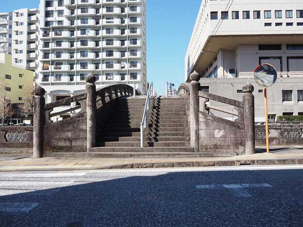 最初、石造アーチ橋が寛文13年(1673年)に架橋されましたが、享保6年(1721年)に洪水で流出しました。その後、2度目の橋が架橋されましたが、また洪水で流出。寛政12年(1800年)にこの位置で3度目のアーチ橋が架橋されましたが、昭和57年(1982年)の洪水で流出しました。