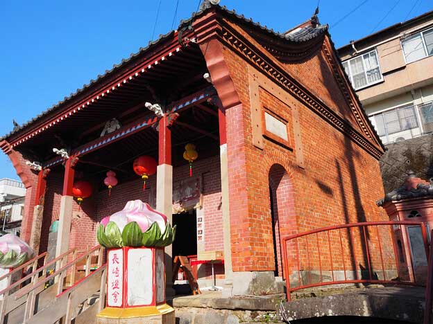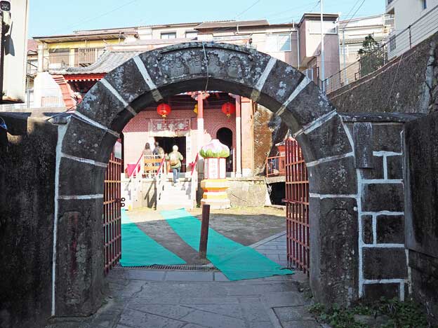 この「観音堂」は、元文2年(1737年)に福建省出身の唐船主によって建立されたと考えられています。天明4年(1784年)の大火で焼失し、その後、再建や幾度かの改修を経て、現在の建物は大正6年(1917年)に改築されたものです。入口のアーチ型の石門は、唐人屋敷時代のものと言われています。