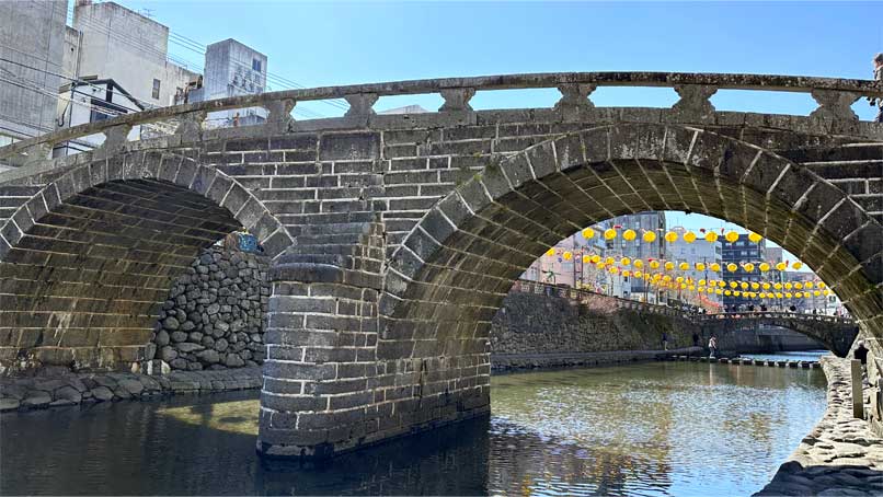 日本初の石造りアーチ橋である「眼鏡橋」のひとつ下流に位置しており、眼鏡橋撮影スポットとして多くの観光客で賑わいます。