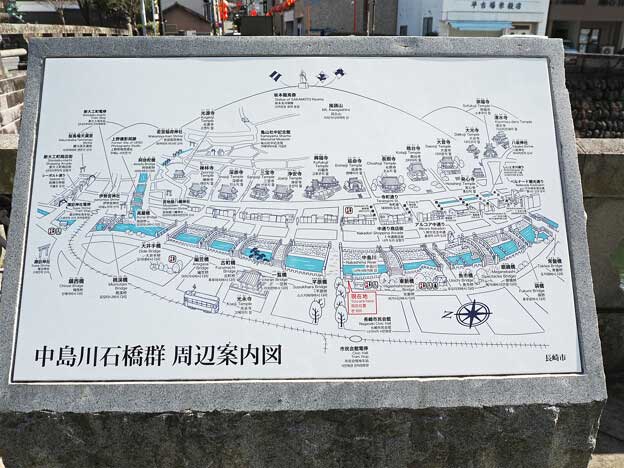 古くは中島川には木の橋が架かっていましたが、享保4年(1647年)の大洪水で多くの橋が流されたことにより、元禄12年(1699年)頃までには、中島川と直交する道路筋の殆どに石橋が架けられました。しかしながら、昭和57年(1982年)の長崎大水害で大きな被害を受け、その殆どを失ってしまいました。その後、復元されたもの、移築復元されたもの、新たにコンクリート橋に造り変えられたものなどありますが、現在も中島川石橋群としての景観を保っています。