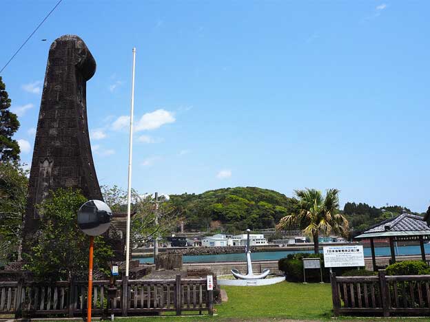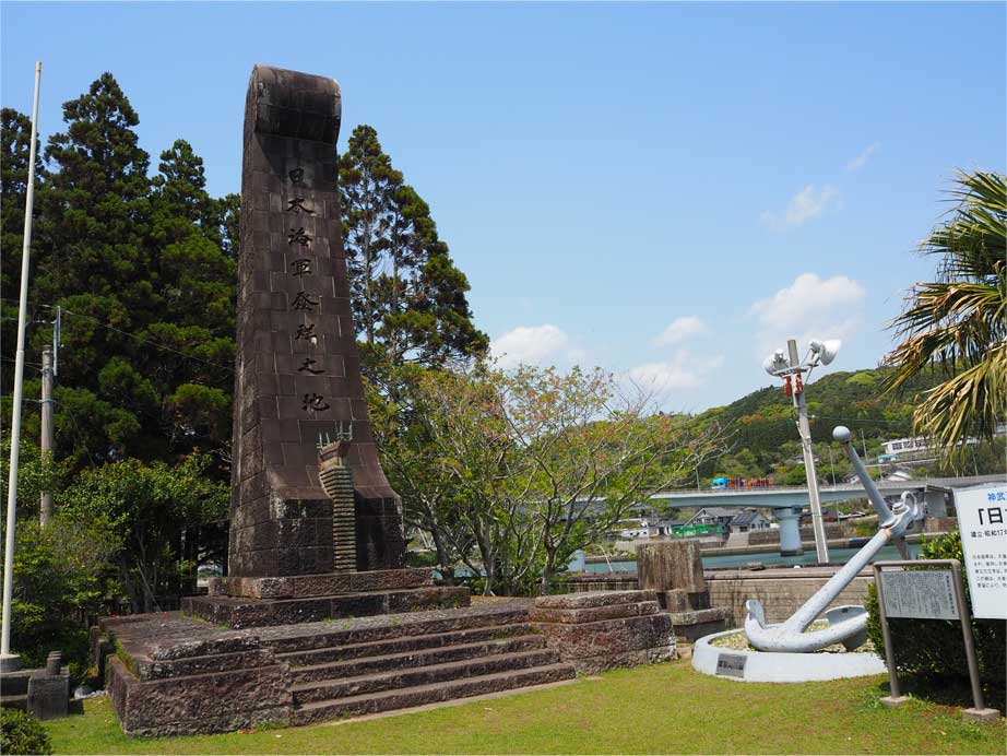 宮崎県日向市の南端にある美々津町には、江戸時代の町割りを残す重要伝統的建造物群保存地区があります。そんな美々津の耳川沿い、美々津港付近の「立磐神社」境内入口に「日本海軍発祥之地碑」があります。