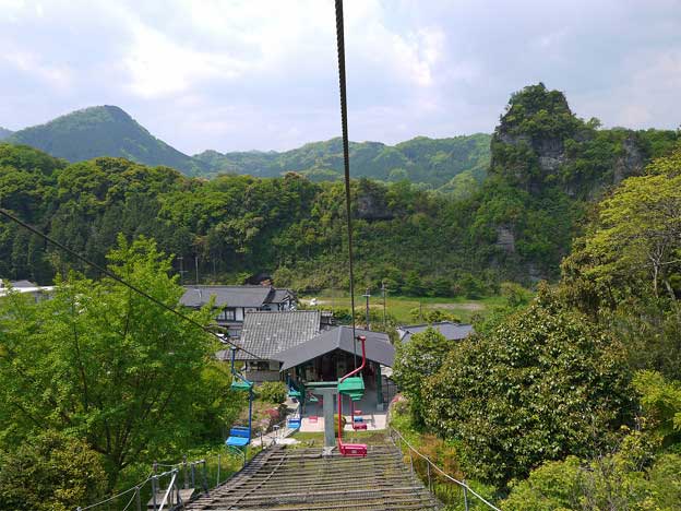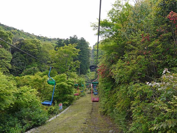 「禅海堂リフト乗り場」からゆらゆらとリフトで出発するとすぐ、眼下に羅漢寺の駐車場前に聳える「古羅漢」を見下ろす事が出来ます。山を切り開いた中を進むリフトは、途中下車の「羅漢寺駅」までは割と緩やかな勾配で、しかしそこから山頂駅までは急勾配で進みます。