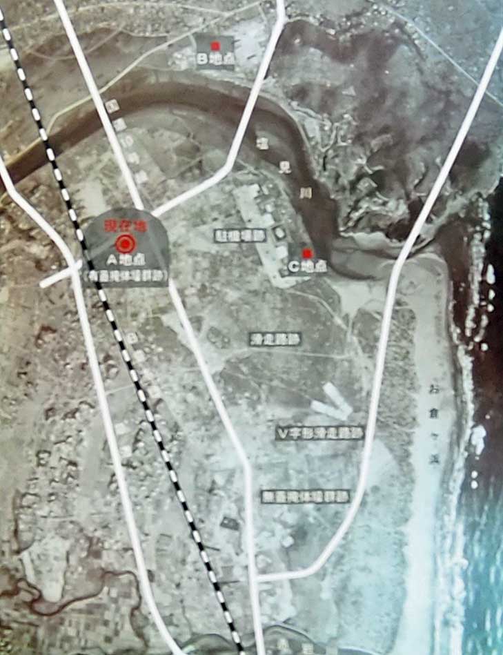 この川の南側、財光寺地区に旧海軍富高飛行場がありました。現在地は地図上のA地点で、ここに飛行機を格納して空襲の被害を防ぐための掩体壕がありました。唯一残っていた掩体壕も道路工事のために2004年(平成16年)2月、解体され、その一部がこの地に歴史の証として保存されました。