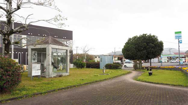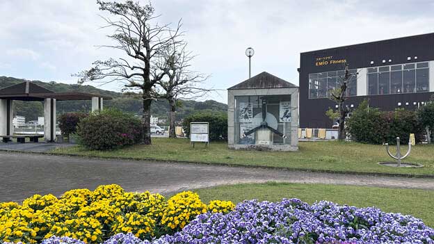 塩見川に架かる大瀛橋(たいえいばし)の袂、「しらさぎ公園」には、軍用機のプロペラが展示されています。このプロペラは「KM-2型航空機用プロペラ」で海上自衛隊より貸与されたもの。KM-2は戦後造られた機体なので、富高海軍航空隊当時のものではありませんが、「富高海軍航空隊」の史実を伝え、恒久平和を願うモニュメントとして設置されています。