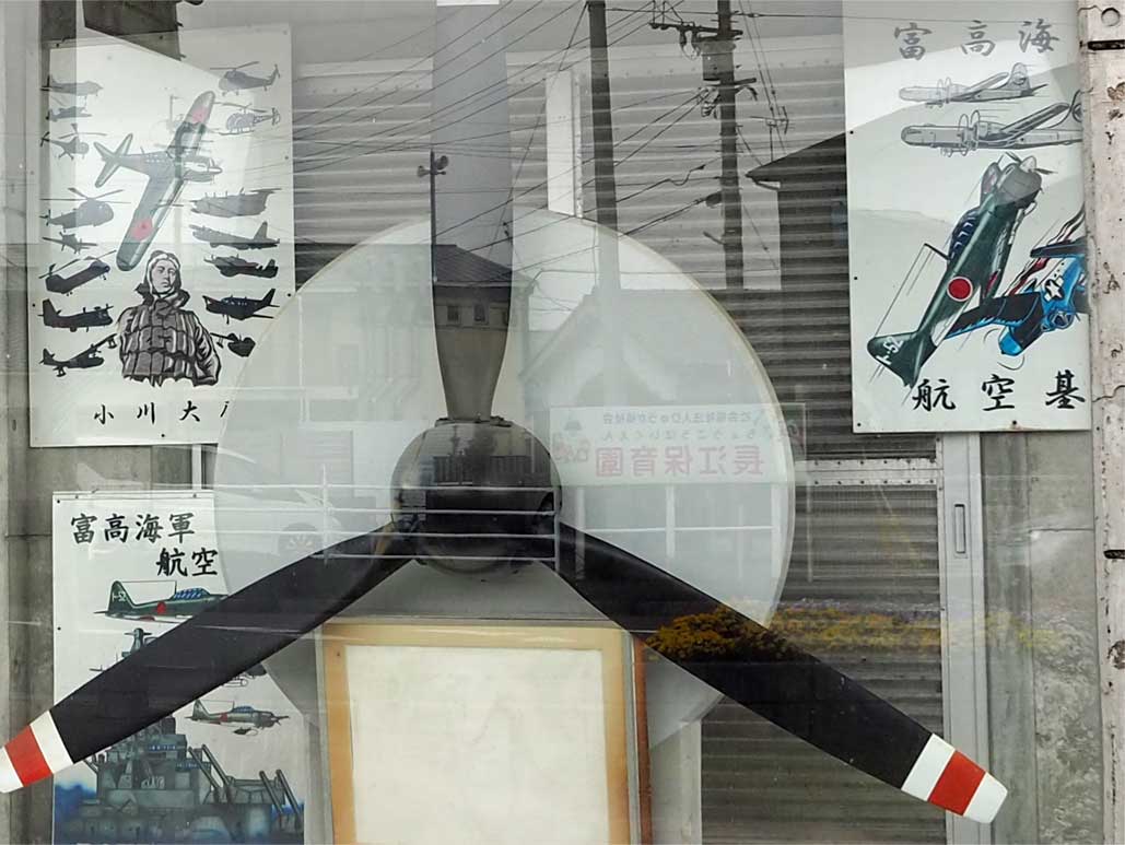塩見川に架かる大瀛橋(たいえいばし)の袂、「しらさぎ公園」には、軍用機のプロペラが展示されています。このプロペラは「KM-2型航空機用プロペラ」で海上自衛隊より貸与されたもの。KM-2は戦後造られた機体なので、富高海軍航空隊当時のものではありませんが、「富高海軍航空隊」の史実を伝え、恒久平和を願うモニュメントとして設置されています。