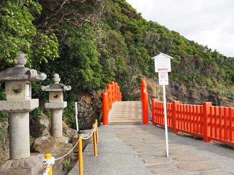 千鳥橋を渡り、徐々に下って行きます。次に見える細くて小さな太鼓橋は「玉橋」です。ここから眼下に見える太平洋と奇岩の景色も絶景です。
