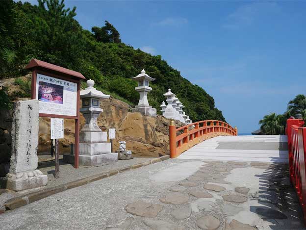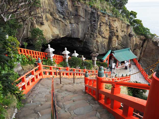 「鵜戸神宮」は、宮崎県日南市の日向灘に面した断崖の中腹に建つ神社で、自然の洞窟の中に本殿・拝殿などが鎮座されています。その為、全国でも珍しい「下り宮」となっています。この洞窟は海水の侵食でできた海食洞であり、1千平方メートル(約三百坪)ほどの広さがあります。