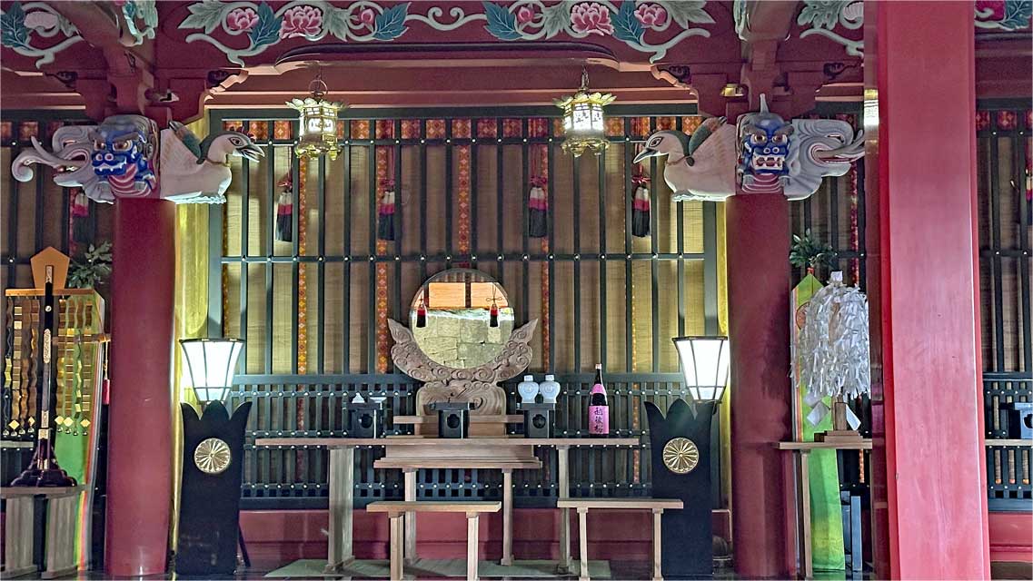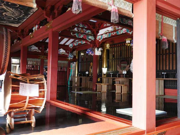 岩窟への入口の鳥居をくぐると、ご本殿が鎮座しています。本殿・幣殿・拝殿が1体となった八棟造(権現造)こけら葺で、宮崎県の有形文化財に指定されています。