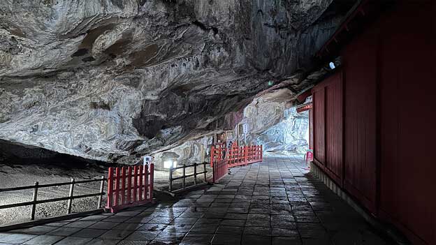 「玉橋」を渡ると、階段を下り、本殿・拝殿のある洞穴へと下って行きます。