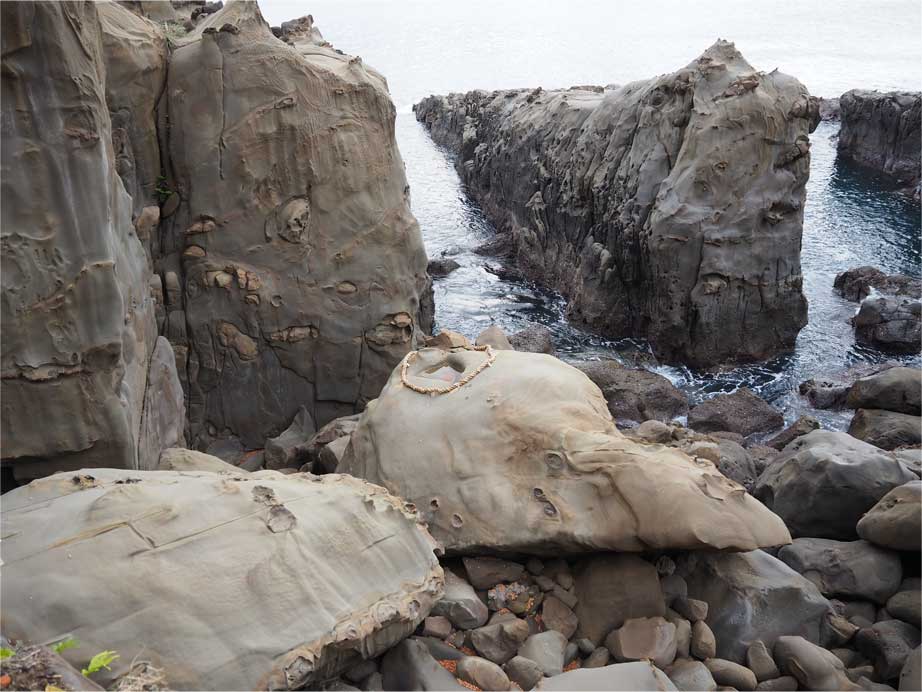宮崎市青島から日向市風田にかけての日南海岸には、宮崎層群(約1200万年前から150万年前までの間、深い海底で砂の層と泥の層が交互に蓄積した層)のなかでも古い時代の地層が露出しており、この砂岩泥岩互層が波の浸食を受けて形成された波食棚や海食洞、ノッチ(岩が窪んだ地形)が随所に見られる。鵜戸崎の南面に見られる波食棚は、鵜戸千畳敷奇岩(鬼の洗濯板)と呼ばれ、県の天然記念物に指定されている。