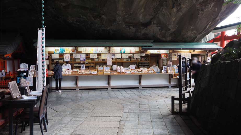 二ノ鳥居より境内に入ると、土産物屋やカフェなどがあり、またお守りなどを販売する「授与所」もあります。土産物屋では「おちちあめ」というお土産が販売されています。これは境内の洞窟内にある霊石『おちち岩 』に由来するものです。※ 御乳岩の御乳水で作られた「御乳飴」は土産物屋ではなく本殿付近で販売されています。
