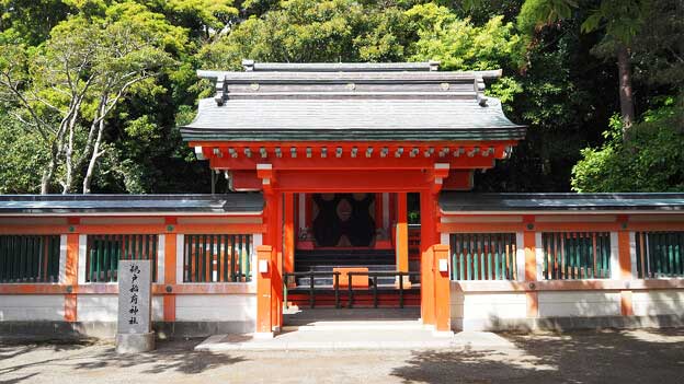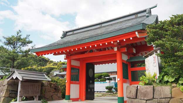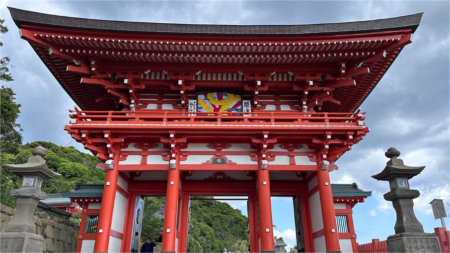 境内を進み、最初に見える朱色の門は「神門」です。神門の先に見える朱色の門は「楼門」です。「神門」と「楼門」の右手は太平洋、左手には社務所や儀式殿、稲荷神社、鵜戸山の頂上にある「御陵」へ続く石段があります。