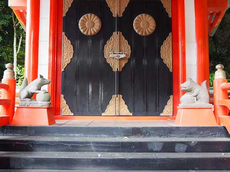 鵜戸神宮の「楼門」をくぐったところ、左手に「吾平山上陵」への入口となる朱色の門が建っています。