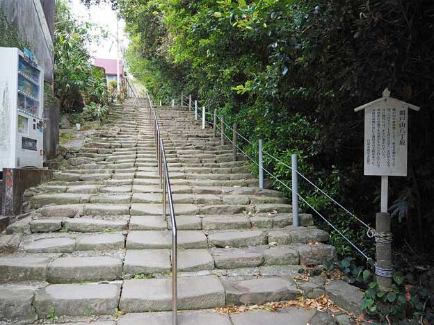 「八丁坂参道」は、一番古い石段参道で、吹毛井の港から神宮の山門まで長さ約800m(八丁)の石段が続いています。鵜戸山の参拝路として、江戸時代にはすでに築かれていました。石段の両側には仁王護国寺の支院がありました。