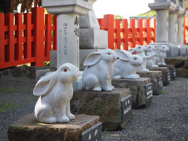 鵜戸神宮で兎モチーフを沢山見かけるのは、鵜戸神宮の神使が兎とされているからです。神使とは、御祭神と最も近い動物のことです。鵜戸神宮のご祭神「鸕鵝草葺不合尊(うがやふきあえずのみこと)」の「鸕鵝」が「卯」や「兎」となったと考えられています。
