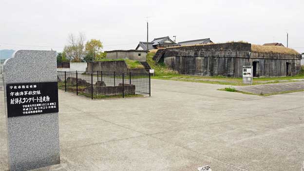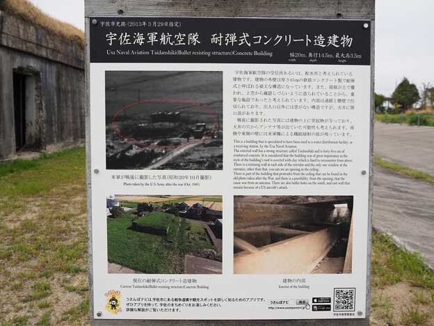 しかし、戦局に敗色が濃くなってくると、昭和20年(1945年)1月頃から有蓋掩体壕が作られるようになり、2月11日には宮崎基地より神雷部隊の一部が転入してきます。神雷部隊は第721海軍航空隊の通称で、人間爆弾「桜花」による特別攻撃隊でした。その頃から練習航空隊ではなく実戦部隊となり、神風特別攻撃隊の中継基地となりました。宇佐海軍航空隊でも、神風特別攻撃隊である「八幡護皇隊」が編成され、沖縄の特攻作戦へ飛び立っていきました。