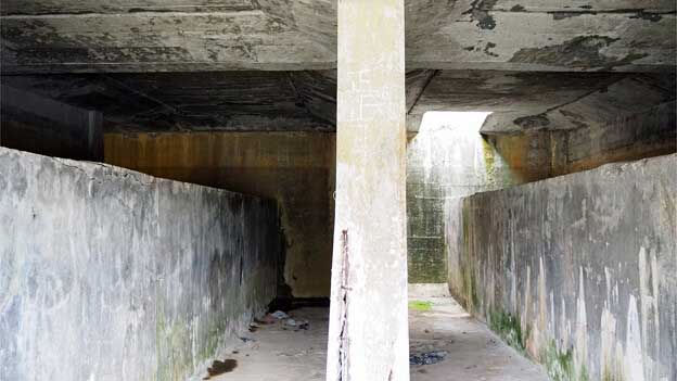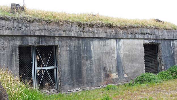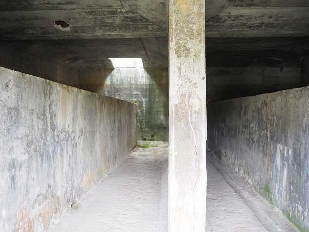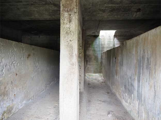 「受信所」あるいは「配水施設」といわれている半地下式のコンクリート造り建物です。防弾効果を上げるため、内部は一段掘り下げられて、外壁の厚さが45cmと頑丈な造りになっています。