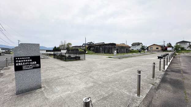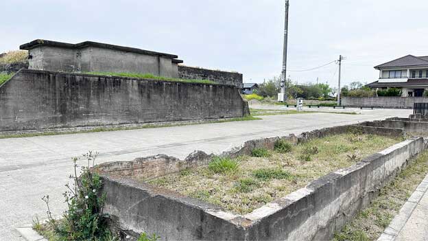 コンクリート造建物の西側に、燃料または水を入れていたと思われるタンクの基礎が2基残っています。建物東側(駐車場側)にも何らかの遺構が残っています。