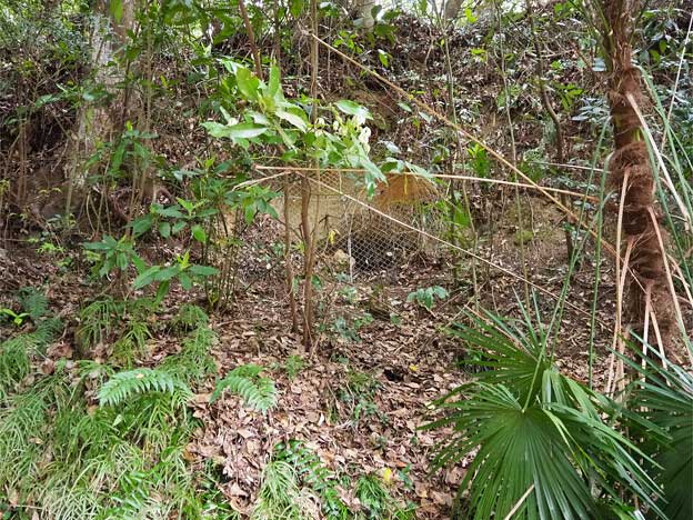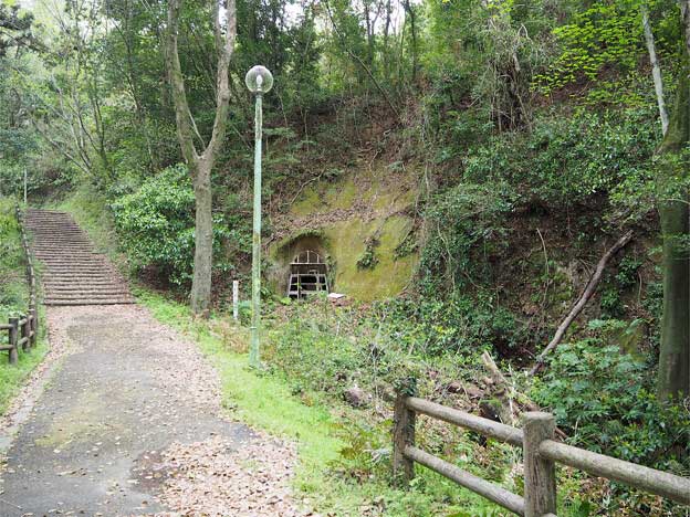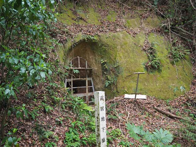 高居地下壕 は、空襲に備えるために駅館川(やっかんがわ)東岸の崖面に掘られた多数の横穴壕です。昭和20年(1945年)2月以降に掘削工事が始まり、4月に宇佐海軍航空隊が壊滅的な空襲を受けたことで、指令部や病室、弾薬庫などを横穴壕に移転させました。総延長146m、内部は5ヵ所に分岐し、迷路のようになっています。